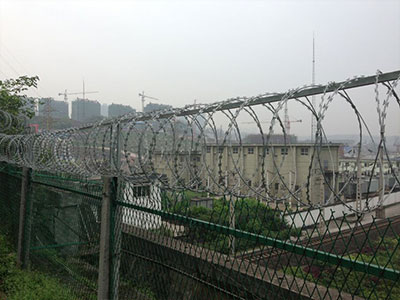 (3)刺絲滾籠由刺絲連接卡扣與固定在支架上的縱向拉筋相連接??v向拉筋與支架的連接采用Φ2.5mm的冷拔鍍鋅鋼絲繞2圈后擰緊固定。支架設置在跨度3m防護柵欄的立柱和跨中位置,其中跨度進設置與立柱上部,支架與防護柵欄采用支架抱箍連接,對于已經(jīng)安裝金屬網(wǎng)片的防護柵欄。刺絲滾籠直接采用Φ2.5mm的冷拔鍍鋅鋼絲或刺絲連接卡扣固定于金屬網(wǎng)橫片和金屬絲上。