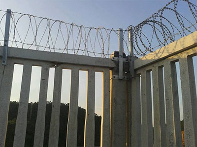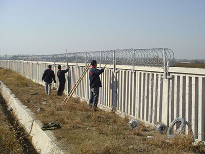 鐵路防護柵欄一改往日焊接鋼絲網(wǎng)柵欄、刺絲網(wǎng)柵欄等產(chǎn)品,改為防御性強、壽命長久的:鋼筋混凝土柵欄+0.5米高刺絲滾籠的防護柵欄。詳細內(nèi)容如下: