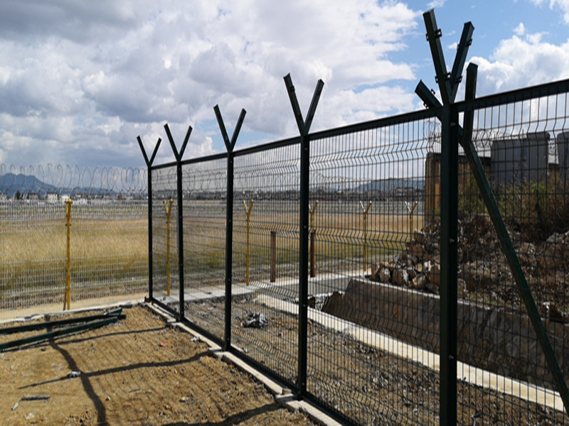 飛行區(qū)圍界角鋼隔離柵又被稱為刀片刺籠隔離網(wǎng),飛行區(qū)圍界角鋼隔離柵最大的特點(diǎn)就是立柱頂端呈Y字型,上面架設(shè)刀片刺繩,大大提高了隔離柵的防御等級(jí)。該產(chǎn)品的網(wǎng)面與三角折彎隔離柵的網(wǎng)面是相同的,經(jīng)過折彎處理增加強(qiáng)度四周焊接50x50角鋼,并且減少單調(diào)乏味。為了避免攀爬發(fā)生,頂端加設(shè)刺絲滾籠,這樣會(huì)增加嚇阻作用,起到防范,并且在外型上形成獨(dú)有的特點(diǎn),令人過目難忘。