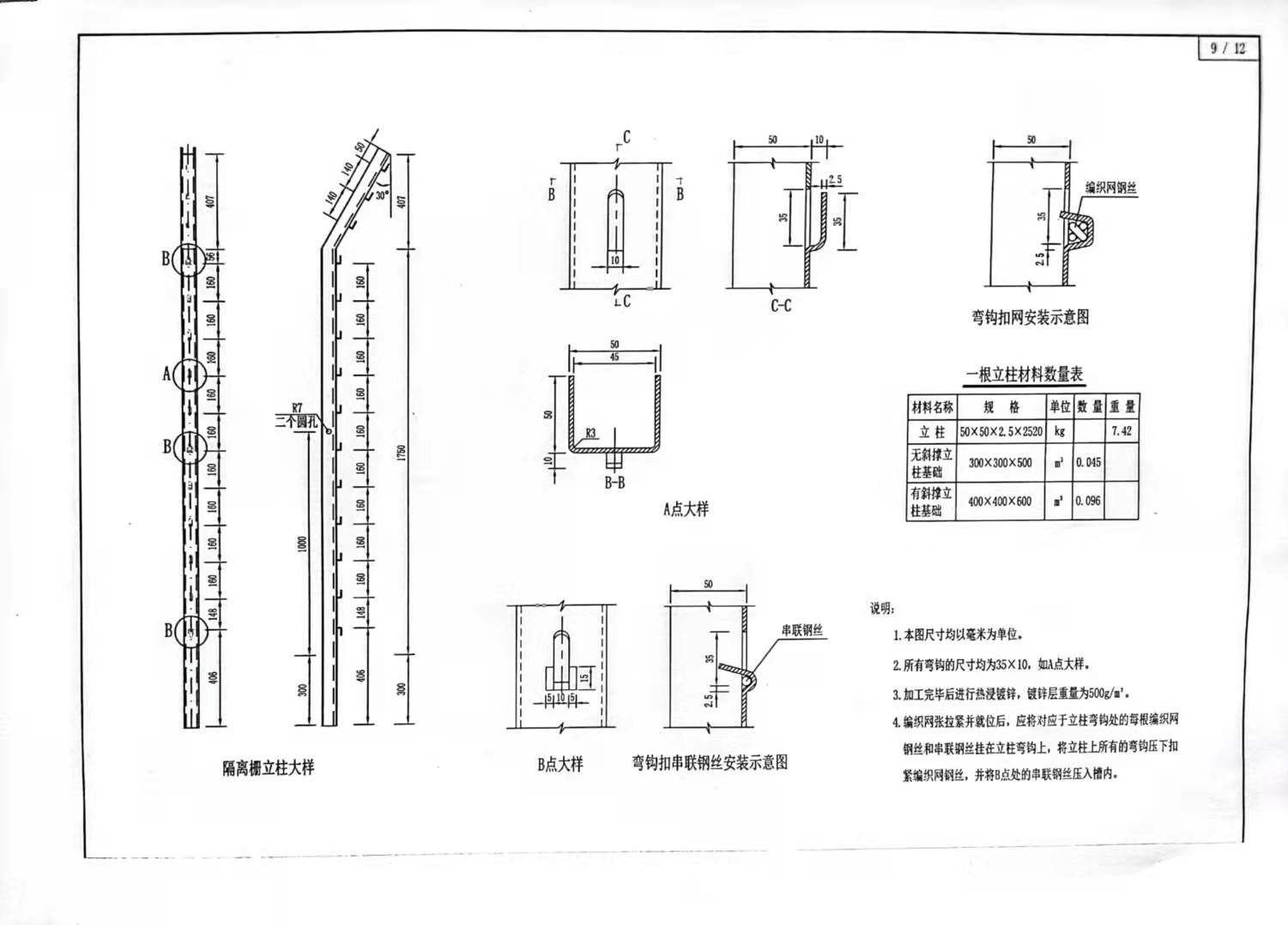 編織網(wǎng)隔離柵的所有金屬部件,均采用熱鍍鋅防腐處理。立柱、斜撐的鍍鋅量為500g/m2,緊固件、連接件的鍍鋅量為350g/m2,隔離柵鋼絲的鍍鋅量為135g/m2。