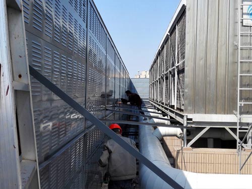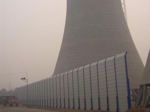 冷卻塔聲屏障聲屏障采用混合型聲屏障,頂部為吸聲單元,以下部分為隔聲單元。合理確定聲屏障的長(zhǎng)度和高度后,可獲得10-25dB(A)的降噪量。